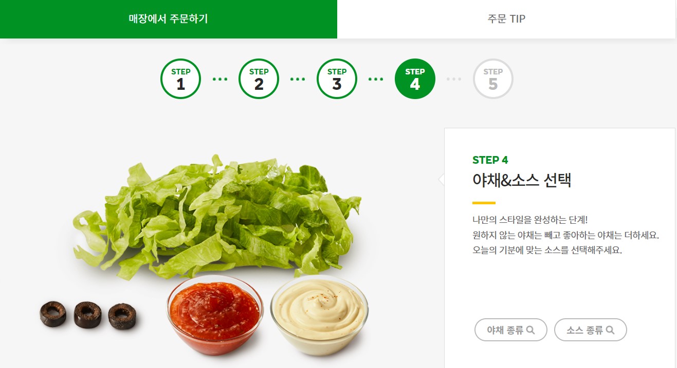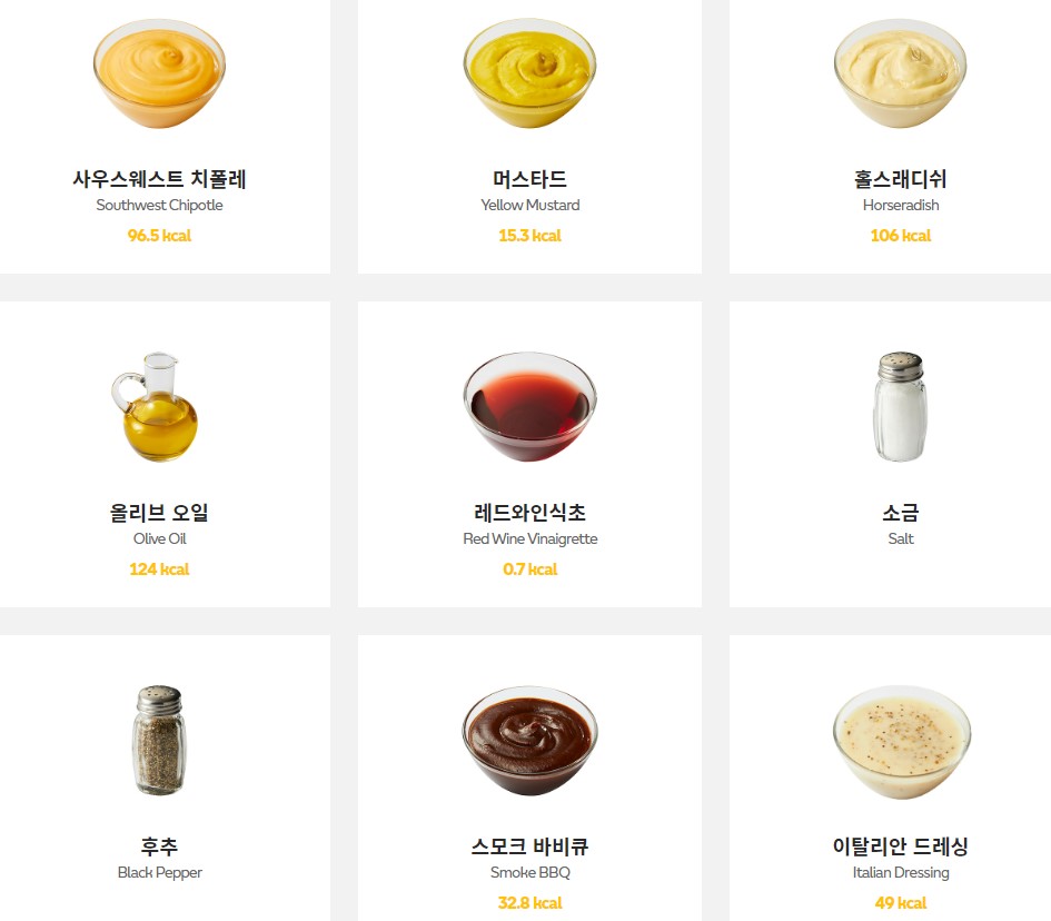 야채를 선택하셨다면 소스를 골라주세요! 소스는 본인이 원하는 대로! 몇 가지이든 상관없으나~~ 너무 많은 소스를 선택하신다면 흠....추천드리지 않습니다. (개인적인 취향일순 있지만) 2 ~3 가지의 소스를 고르시는 것을 추천드립니다. 소스도 사진 아래에 간단한 설명을 해놓았으니 참고하세요!!