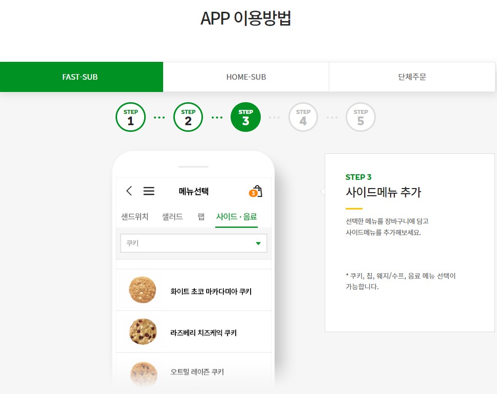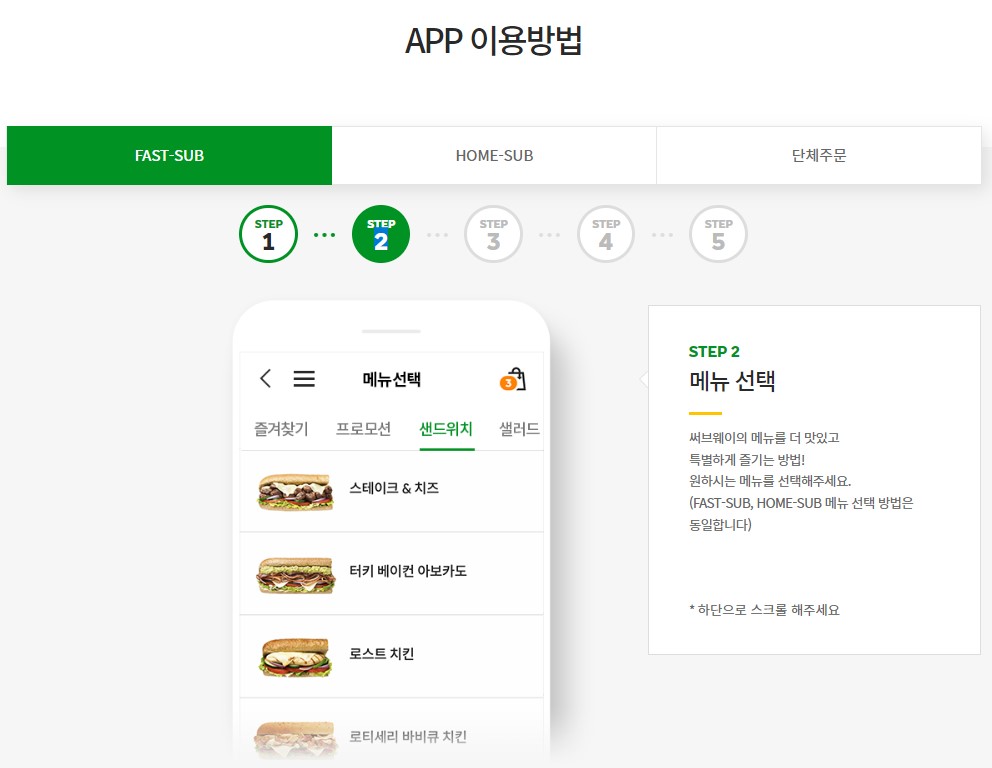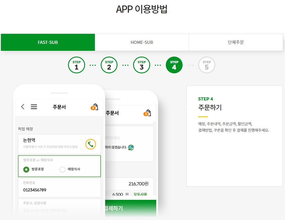(Fast-sub : 앱을 이용하여 주문 후 Pick up 하시거나 매장에서 드시는 겁니다)