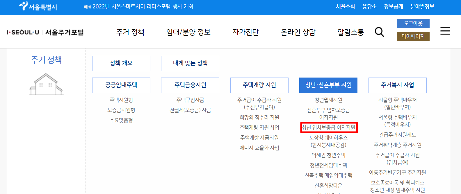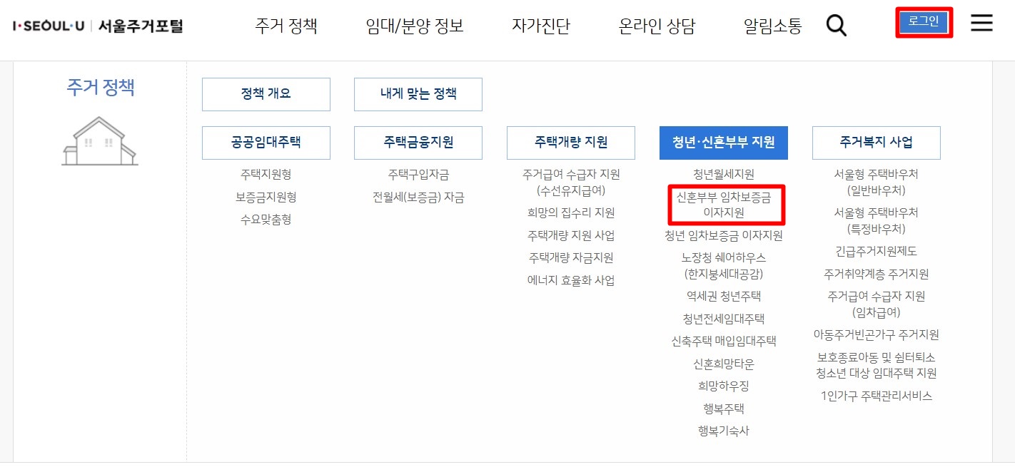 메인 홈페이지입니다. 일단 로그인을 해주신 후에, 주거 정책 메뉴 탭을 갖다 놓으면 아래와 같은 메뉴가 나옵니다. 여기서 청년 신혼부부 지원에 신혼부부 임차보증금 이자지원을 클릭해줍니다.