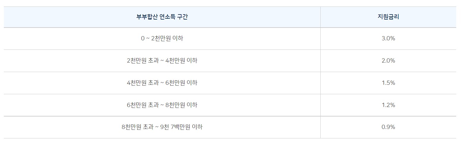 연 소득에 따른 이자지원금리 : 최대 연 3.0% 이하
