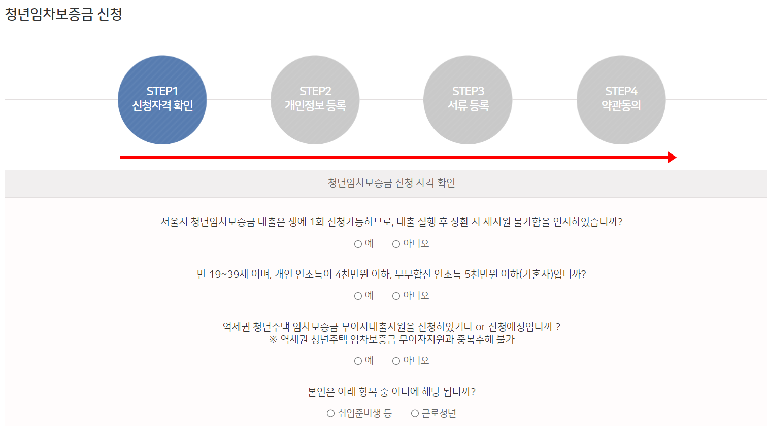 그러면 일단 자격 진단 신청 페이지가 나오실겁니다. 자격이 되는 지 질문을 보시고 해당 단추를 누르시고 다음단계를 눌러주세요.